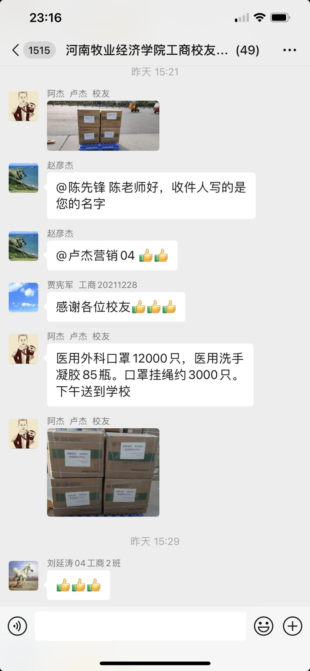 学院班子成员王筝、贾宪军、姬爱国、陈先锋、范森以及昔日的恩师赵敏、王桂朵、权太举、王国辉等为校友们慷慨激昂的语言和无私奉献的举动而深深动容,纷纷有感而发,感恩校友们对母校的拳拳之心,感谢校友们的守望相助,援助防疫物资支持全校师生抗疫工作,与母校师生一同共克时艰,为师生安全提供了安全有力的基础保障!